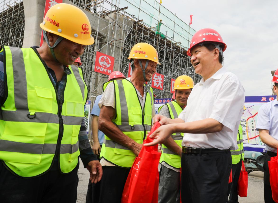 在慰問現(xiàn)場,楊正福與施工人員親切交談,送上慰問品,了解他們來自哪里,生活如何。叮囑他們,在做好工程施工、確保工程質(zhì)量優(yōu)良的同時(shí),也要注意身體,避開高溫作業(yè),做好高溫下的各項(xiàng)防護(hù)工作,安全生產(chǎn)。