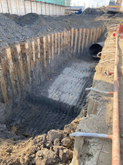 湯汪污水處理廠三期工程二沉池工藝污水進(jìn)水管道施工,該管道是三期生物池至二沉池進(jìn)水主干管,涉及基坑支護(hù)、基坑降水、土方開挖及起重吊裝工程,屬于重要分部分項工程。該工藝污水管長達(dá)54米,管徑為1.8米,項目推進(jìn)過程中,各參建方高度重視、深入現(xiàn)場,有針對的制定了專項施工方案和安全技術(shù)措施,做到責(zé)任到人,確保施工質(zhì)量和安全。