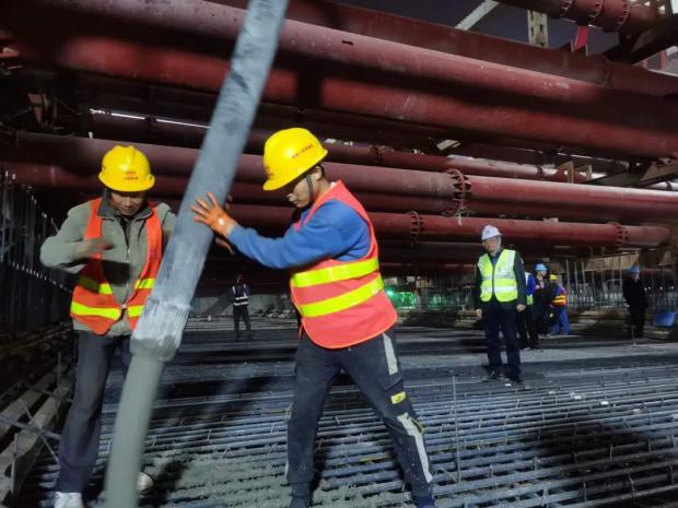 為保證首塊底板優(yōu)質(zhì)高效完成澆筑,項(xiàng)目部高度重視施工安全和工程質(zhì)量,并充分做好施工前各項(xiàng)準(zhǔn)備工作。一是確保項(xiàng)目管理人員和作業(yè)人員安全、技術(shù)交底到位;二是落實(shí)領(lǐng)導(dǎo)帶班制、旁站制及三檢制,嚴(yán)把混凝土原材料質(zhì)量關(guān),澆筑過(guò)程中技術(shù)人員全程盯控,嚴(yán)格按照施工工藝施工,實(shí)現(xiàn)質(zhì)量控制目標(biāo);三是安全員從過(guò)程上嚴(yán)格監(jiān)督安全隱患,堅(jiān)持早發(fā)現(xiàn)、早報(bào)告、早解決,做好安全防范工作。