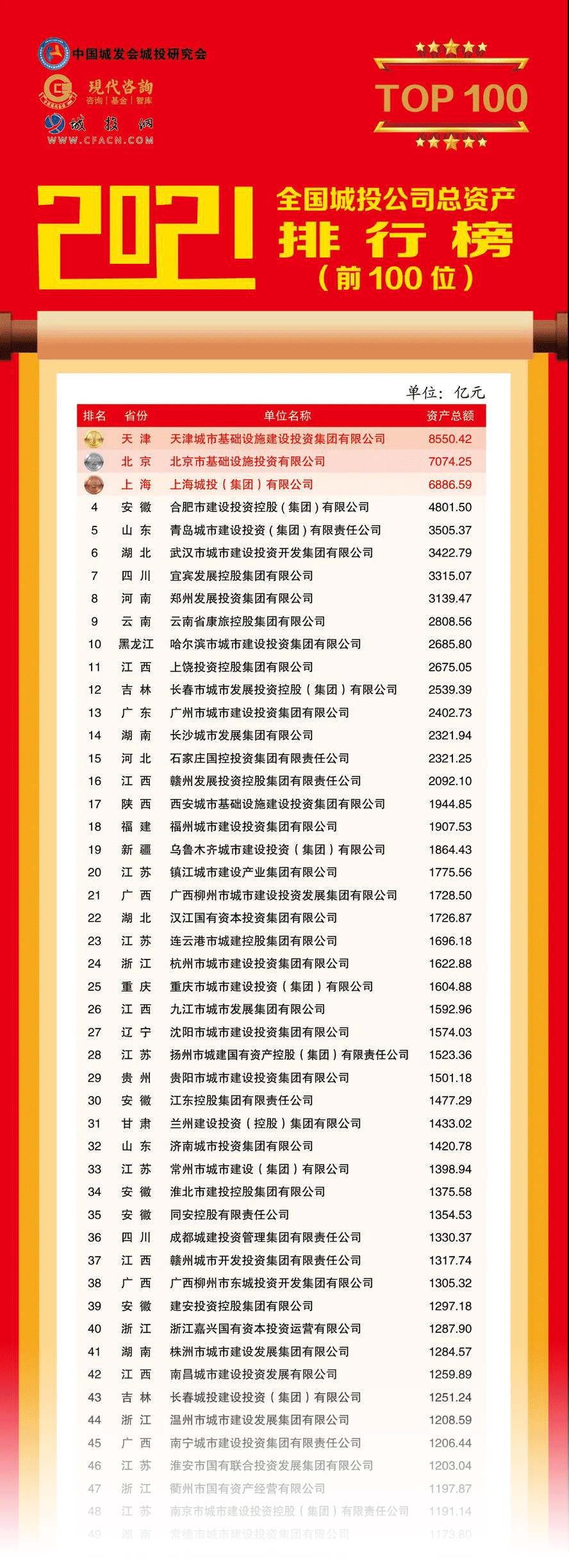 該排行榜由中國城市發(fā)展研究會(huì)城市建設(shè)投融資研究專業(yè)委員會(huì)(簡稱”中國城發(fā)會(huì)城投研究會(huì)”)、江蘇現(xiàn)代資產(chǎn)投資管理顧問有限公司(簡稱“現(xiàn)代咨詢”)和城投網(wǎng)聯(lián)合發(fā)布,迄今已連續(xù)發(fā)布8年,主要反映全國城投公司規(guī)模變化的總資產(chǎn)排名情況,目前已成為全國城投行業(yè)群體發(fā)展?fàn)顩r和城投轉(zhuǎn)型升級的權(quán)威發(fā)布。
