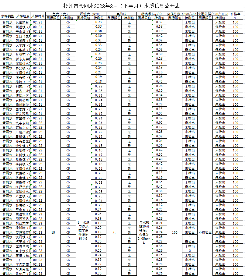 揚(yáng)州市管網(wǎng)水2022年2月(下半月)水質(zhì)信息公開(kāi)表
