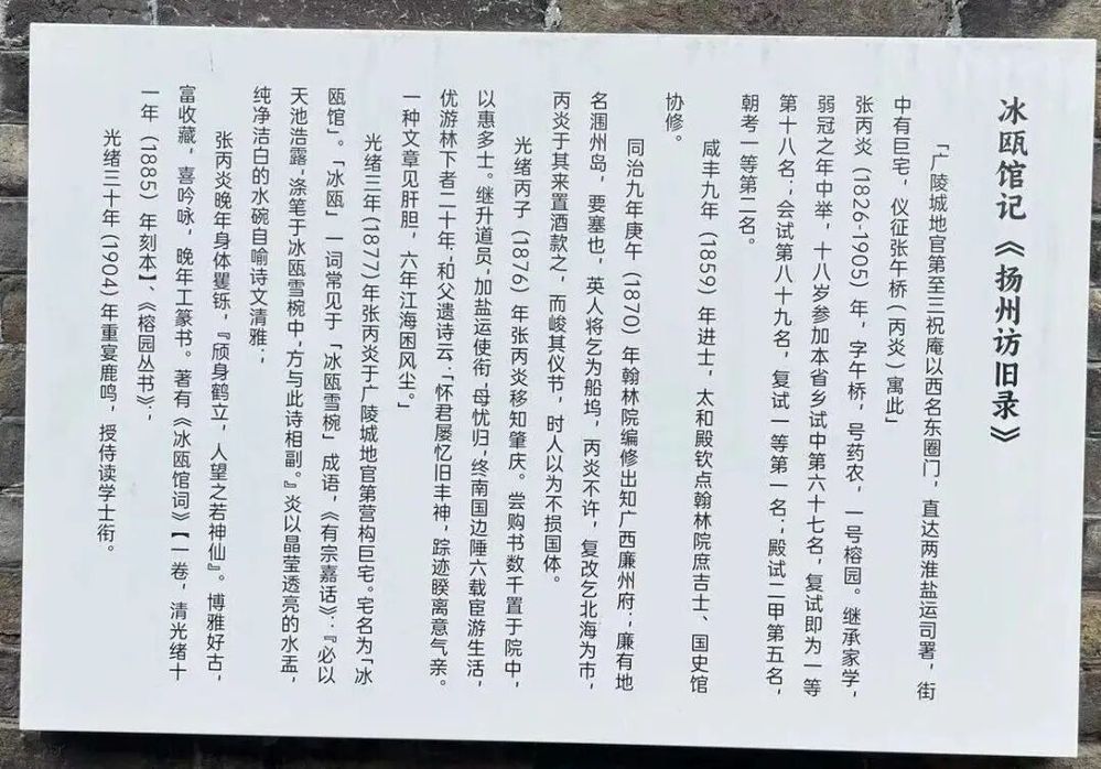 張丙炎的一生,橫跨晚清政治變革與文化轉型。他在嶺南的政績、對包世臣學術的承襲、對鄉(xiāng)邦文獻的守護,以及冰甌館的營建,共同構建起一個士大夫的文化樣本。其故居經修繕后獲評揚州市文物保護單位,更以“民宿+文化空間”模式,成為傳統(tǒng)建筑活化利用的典范。