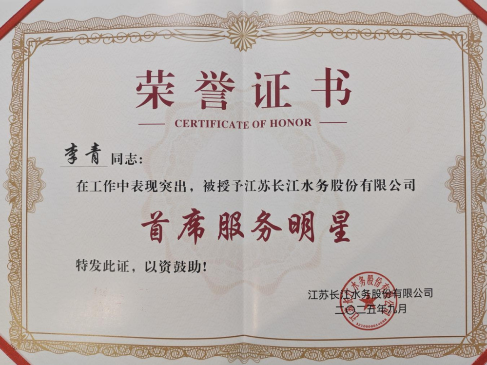 如今,公司授予李青“長江水務(wù)首席服務(wù)明星”榮譽(yù)稱號,這不僅是對他三十余載在一線崗位默默耕耘、無私奉獻(xiàn)的充分肯定,更是對他始終堅(jiān)守初心、踐行服務(wù)為民宗旨崇高精神的最高贊譽(yù)。這份榮譽(yù)不僅彰顯了李青個(gè)人的成就,更凝聚著全體水務(wù)一線員工的辛勤付出。