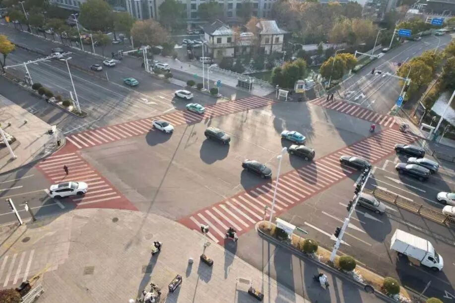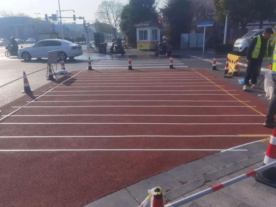 此次彩色路面與普通路面形成高對比視覺沖擊,通過視覺分區(qū),強化“行人優(yōu)先”的路權屬性,有效減少人車搶行沖突;表面的凹凸紋理使雨天的摩擦系數(shù)提升2-3倍,大幅降低濕滑路段交通事故發(fā)生率;采用環(huán)氧樹脂和陶瓷骨料復合材料,耐磨性強、抗老化性優(yōu),使用壽命遠超傳統(tǒng)標線,更具實用性與經濟性,為揚州市民交通出行保駕護航。