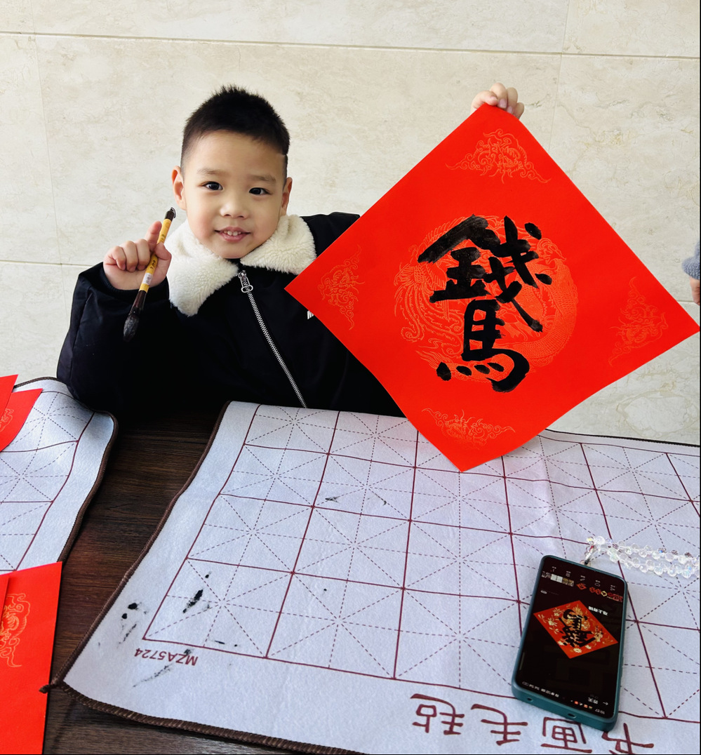 “媽媽,你看我寫的‘馬上有錢’!”“爸爸,我要把這個(gè)‘馬上有?!N在我家房門上?!彪m然筆觸稚嫩,卻飽含童真與心意,不少孩子還發(fā)揮創(chuàng)意,在福字旁添畫馬蹄、祥云、煙花等圖案,讓作品更顯生動(dòng)活潑。現(xiàn)場歡聲笑語不斷,家長們或在旁協(xié)助,或用手機(jī)記錄溫馨瞬間、與孩子合影留念,處處暖意融融、年味十足。